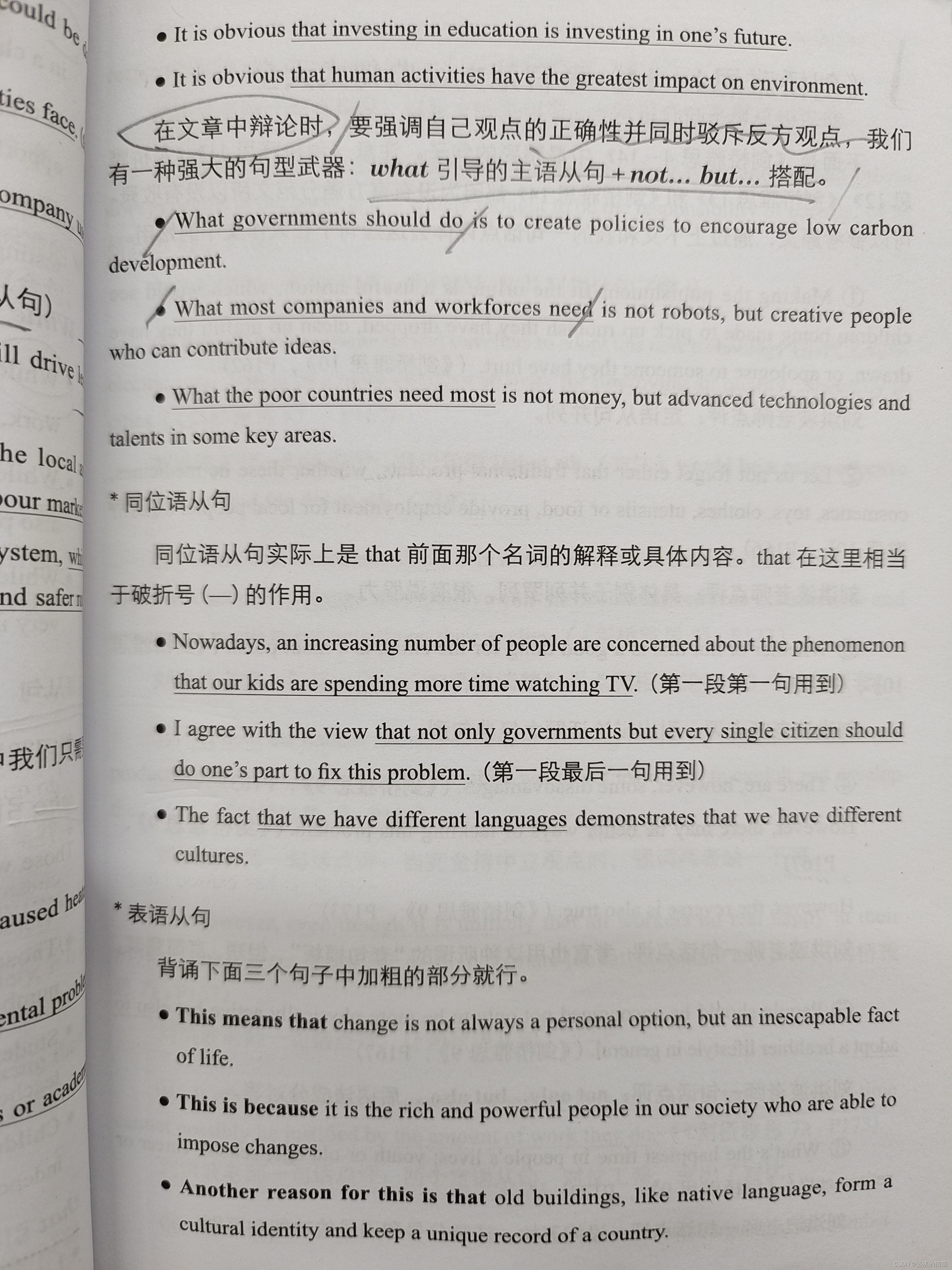 在文章中辩论时,要强调自己观点的正确性并同时驳斥反方观点,我们有一种强大的有型武器: what引导的主语从句+not... but...搭配。
