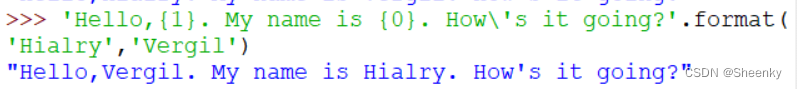 'Hello,{1}. My name is {0}. How\'s it going?'.format('Hialry','Vergil')