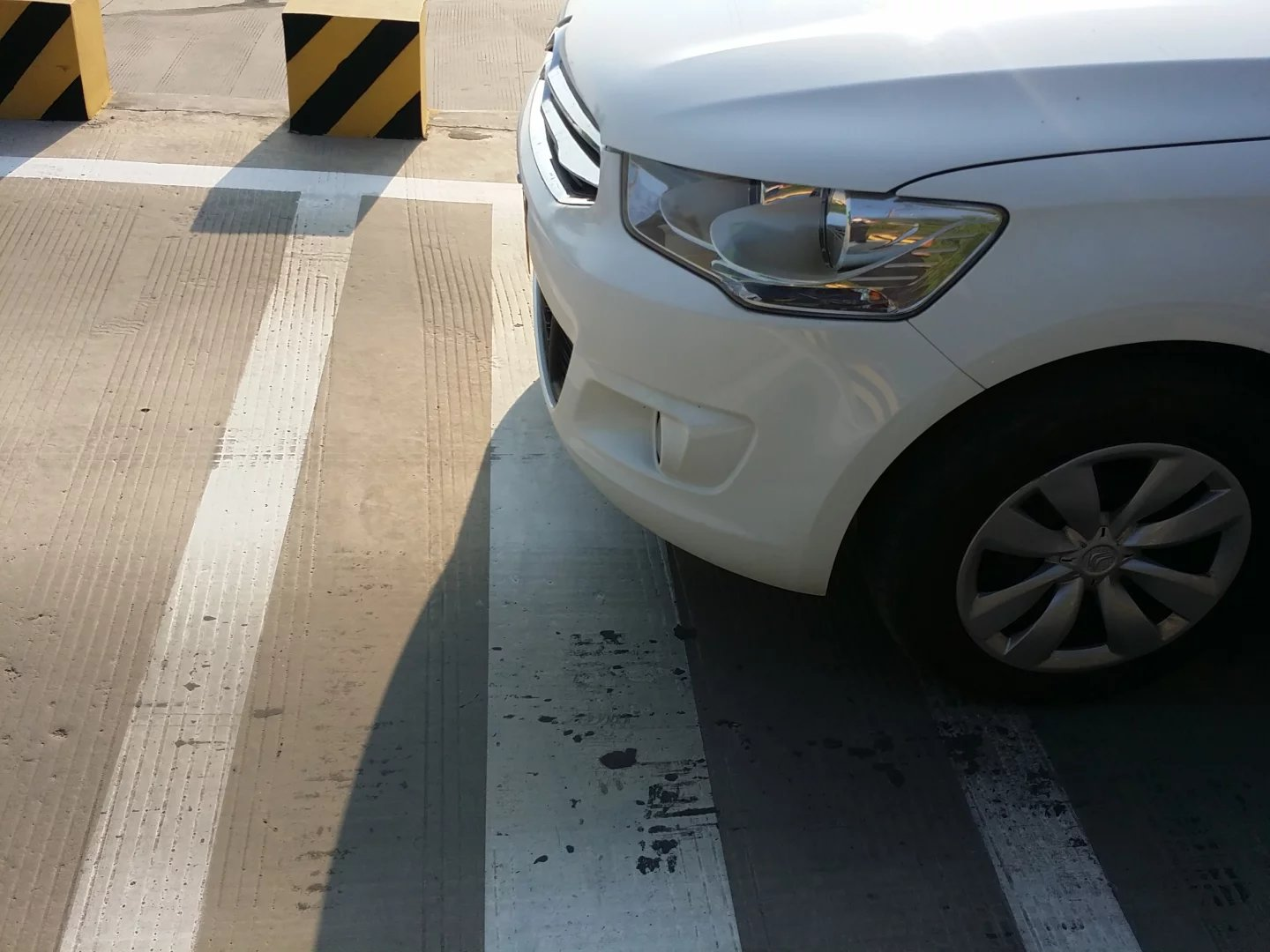车头过前方字体慢松离合,直至完全松开,让车辆怠速上桥,车辆上桥时要一直调校点位,使左参考点始终对齐前方参考点,当车头过第一条庄杆线,迅速向左侧摆头,观察左后视镜下沿。