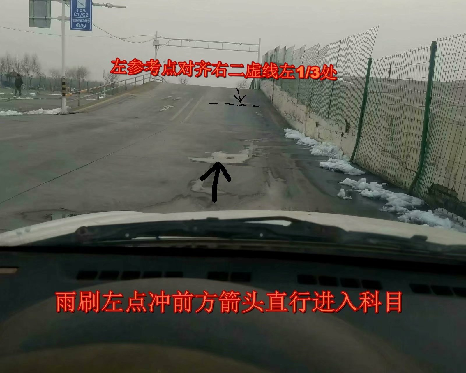 (雨刷左参考点对准前方箭头直行,当箭头消失后,将雨刷右参考点沿科目右线左边缘直行,或左参考点对齐右二虚线1/2处)
