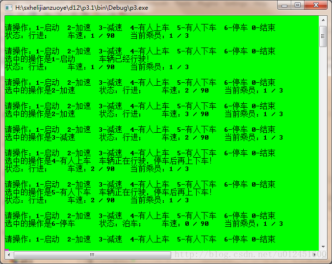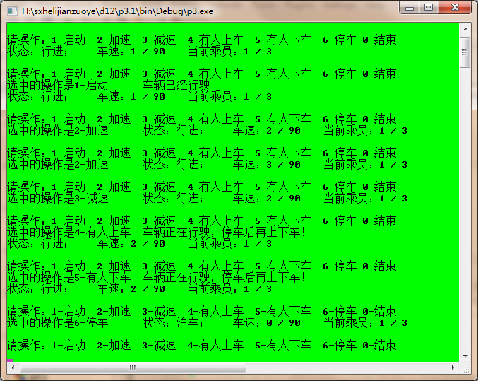 #include <iostream> #include<conio.h> #include <windows.h> using namespace std; enum VehicleStaus {rest, running}; //车辆状态:泊车、行进 class Vehicle //车辆类 { protected: int maxSpeed; //最大车速 int currentSpeed; //当前速度 int weight; //车重 VehicleStaus status; //rest-泊车状态;running-行进状态 public: Vehicle(int maxS, int w); //构造函数,初始时,当前速度总为0且处在停车状态 void start(); //由rest状态到running, 初速为1 void stop(); //由running状态到rest, 当前速度小于5时,才允许停车 void speed_up(); //加速,调用1次,速度加1 void slow_down(); //减速,调用1次,速度减1,速度为0时,停车 }; //构造函数,初始时,当前速度总为0且处在停车状态 Vehicle::Vehicle(int maxS, int w):maxSpeed(maxS), currentSpeed(0),weight(w), status(rest) {} //启动:由rest状态到running, 初速为1 void Vehicle::start() { if (status==rest) { status=running; currentSpeed=1; } else cout<<"车辆已经行驶!"<<endl; } //由running状态到rest, 当前速度小于5时,才允许停车 void Vehicle::stop() { if (status==running) if(currentSpeed<5) { status=rest; currentSpeed=0; } else cout<<"车速太快!先减速再停车……"<<endl; else cout<<"车辆未启动!"<<endl; } //加速,调用1次,速度加1 void Vehicle::speed_up() { if (status==running) if(currentSpeed<maxSpeed) ++currentSpeed; else cout<<"请不要超速行驶……"<<endl; else cout<<"车辆未启动!"<<endl; } //减速,调用1次,速度减1,速度为0时,停车 void Vehicle::slow_down() { if (status==running) { if(currentSpeed>0) --currentSpeed; } else cout<<"车辆未启动!"<<endl; if(currentSpeed==0) status=rest; } class Bicycle :virtual public Vehicle //()自行车类 { protected: double height; //车高 public: Bicycle(int maxS=10, int w=50, int h=0.7); //定义构造函数 }; Bicycle::Bicycle(int maxS, int w, int h):Vehicle(maxS, w),height(h) {} class Motorcar : virtual public Vehicle//()机动车类 { protected: int seatNum; //座位数 int passengerNum; //乘客人数 public: Motorcar(int maxS=150, int w=1500, int s=5, int p=1); //定义构造函数 void addPassenger(int p=1); //搭载乘客,超员要拒载,有人下车时,p为负数。当然车上乘客至少有1个(司机)。上下车时要保证安全…… }; //定义构造函数 Motorcar::Motorcar(int maxS, int w, int s, int p): Vehicle(maxS, w),seatNum(s),passengerNum(p) {} //搭载乘客,超员要拒载,有人下车时,p为负数。当然车上乘客至少有1个(司机)。上下车时要保证安全…… void Motorcar::addPassenger(int p) { if (status==running) { cout<<"车辆正在行驶,停车后再上下车!"<<endl; } else { passengerNum+=p; if(passengerNum>seatNum) { passengerNum=seatNum; cout<<"涉嫌超员,已清理后达到满员!"<<endl; } else if (passengerNum<1) { passengerNum=1; cout<<"请司机不要离开岗位!"<<endl; } } } class Motorcycle: public Bicycle, public Motorcar //()摩托车类 { public: Motorcycle(int maxS=90, int w=100, int s=3, int p=1, int h=0.7); //定义构造函数 void show(); //显示摩托车的运行状态 }; //定义构造函数 Motorcycle::Motorcycle(int maxS, int w, int s, int p, int h):Vehicle(maxS, w),Bicycle(maxS, w, h),Motorcar(maxS, w, s, p) {} //显示摩托车的运行状态 void Motorcycle::show() { cout<<"状态:"; if(status==rest) cout<<"泊车;\t"; else cout<<"行进;\t"; cout<<"车速:"<<currentSpeed<<" / "<< maxSpeed <<"\t当前乘员:"<<passengerNum<<" / "<< seatNum << endl; } int main( ) { Motorcycle m; bool end=false; while (!end) { cout<<"请操作:1-启动 2-加速 3-减速 4-有人上车 5-有人下车 6-停车 0-结束"<<endl; char keydown= _getch(); //_getch()返回键盘上读取的字符,应包含头文件<conio.h> switch(keydown) { case '1': cout<<"选中的操作是1-启动\t"; m.start(); break; case '2': cout<<"选中的操作是2-加速\t"; m.speed_up(); break; case '3': cout<<"选中的操作是3-减速\t"; m.slow_down(); break; case '4': cout<<"选中的操作是4-有人上车\t"; m.addPassenger(); break; case '5': cout<<"选中的操作是5-有人下车\t"; m.addPassenger(-1); break; case '6': cout<<"选中的操作是6-停车\t"; m.stop(); break; case '0': end=true; break; } m.show(); cout<<endl; Sleep(200); //要包含头文件<windows.h> } return 0; }