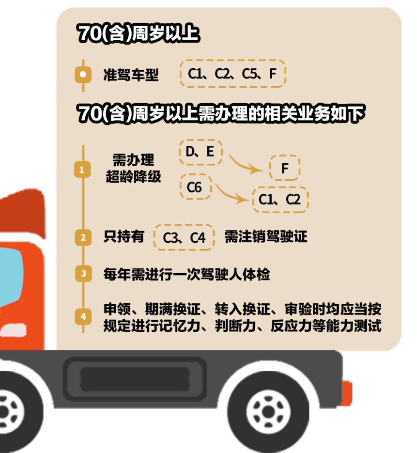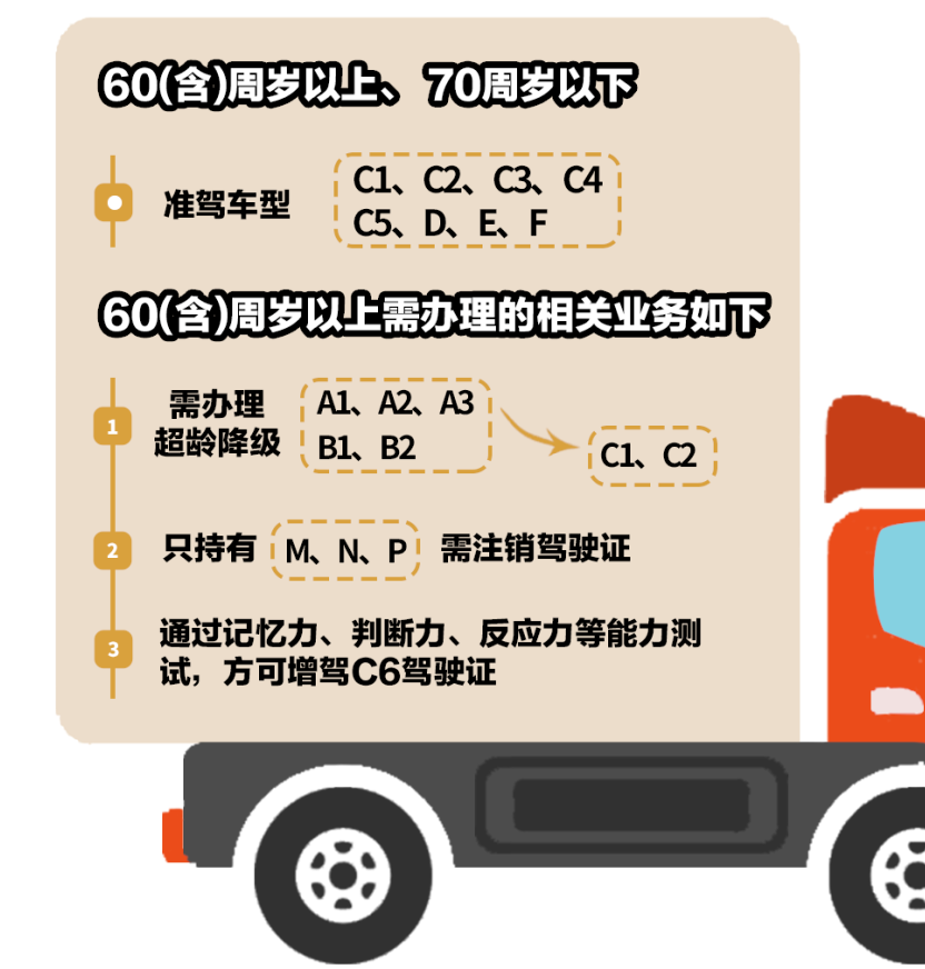 答:申领轻便摩托车驾驶证的(F照),在18周岁以上、无年龄上限;申领普通摩托车驾驶证的(D、E照),在18周岁以上,60周岁以下。