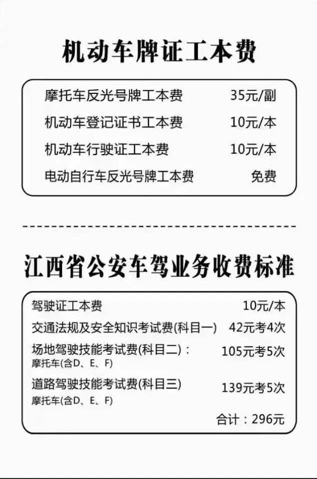 答:摩托车(含电动摩托车、电动轻便摩托车)上牌共55元,电动自行车上牌免费;驾驶证考试(D、E、F照)费用为江西省统一统一收费标准,共296元。