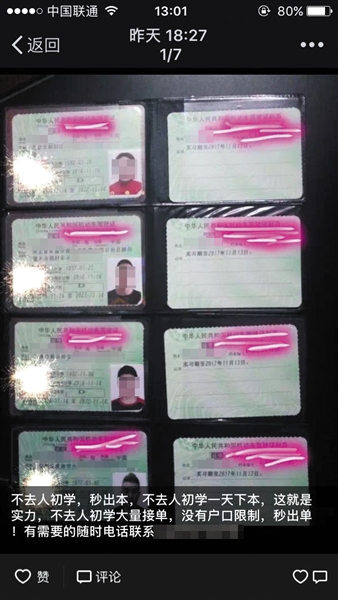 在一名北京车虫的朋友圈里,记者简单统计,其晒出的办理于11月的摩托车驾照,超过30本。以每本收费3000元计算,其11月上半月出售驾照的交易额已经达到9万元。