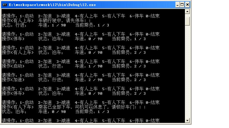 /* * 程序的版权和版本声明部分 * Copyright (c)2012, 烟台大学计算机学院学生 * All rightsreserved. * 文件名称: object.cpp * 作者:赵 洋 * 完成日期: 2013年5 月24 日 * 版本号: v1.0 * 输入描述:无 * 问题描述: * 程序输出: */ #include <iostream> #include<conio.h> #include <windows.h> using namespace std; enum vehicleStaus {rest, running}; //车辆状态:泊车、行进 class vehicle //车辆类 { protected: int maxSpeed; //最大车速 int currentSpeed; //当前速度 int weight; //车重 vehicleStaus status; //rest-泊车状态;running-行进状态 public: vehicle(int maxS, int w); //构造函数,初始时,当前速度总为0且处在停车状态 void start(); //由rest状态到running, 初速为1 void stop(); //由running状态到rest, 当前速度小于5时,才允许停车 void speed_up(); //加速,调用1次,速度加1 void slow_down(); //减速,调用1次,速度减1,速度为0时,停车 }; vehicle::vehicle(int maxS, int w):maxSpeed(maxS), currentSpeed(0),weight(w), status(rest){} void vehicle::start() { if (status==rest) { status=running; currentSpeed=1; } else cout<<"车辆已经行驶!"<<endl; } void vehicle::stop() { if(status==running ) { if(currentSpeed<5) { status=rest; currentSpeed=0; } else cout<<"先减速在停车!"<<endl; } else cout<<"车辆未启动!"<<endl; } void vehicle::speed_up() { if(status==running) if(currentSpeed<maxSpeed) ++currentSpeed; else cout<<"请不要超速行驶!!"<<endl; else cout<<"车辆未启动!"<<endl; } void vehicle::slow_down() { if(status==running) { if(currentSpeed>0) --currentSpeed; } else cout<<"车辆未启动!"<<endl; if(currentSpeed==0) status=rest; } class bicycle :virtual public vehicle//(1)自行车类的虚基类为车辆类 { protected: double height; //车高 public: bicycle(int maxS=10, int w=50, int h=0.7); //定义构造函数 }; bicycle::bicycle(int maxS,int w,int h):vehicle(maxS,w),height(h){} class motorcar : virtual public vehicle//(2)机动车类的虚基类也为车辆类 { protected: int seatNum; //座位数 int passengerNum; //乘客人数 public: motorcar(int maxS=150, int w=1500, int s=5, int p=1); //定义构造函数 void addPassenger(int p=1); //增加搭载的乘客,超员要拒载,有人下车时,p为负数。当然车上乘客至少有1个(司机)。只有车停稳后才能上下客。 }; motorcar::motorcar(int maxS,int w,int s,int p):vehicle(maxS,w),seatNum(s),passengerNum(p){} void motorcar::addPassenger(int p) { if(status==running) cout<<"车辆行驶中,请先停车!!"<<endl; else { passengerNum+=p; if(passengerNum>seatNum) { cout<<"车辆超载,不能搭载乘客!!"<<endl; passengerNum=seatNum; } if(passengerNum<=1) { cout<<"乘客已全部下车,司机可以休息了,请锁好车门!!!"<<endl; passengerNum=1; } } } class motorcycle:public bicycle,public motorcar //(3)摩托车类的基类为自行车类和机动车类 { public: //定义构造函数 motorcycle(int maxS=90, int w=100, int s=3, int p=1, int h=0.7); void show(); //显示摩托车的运行状态 }; motorcycle::motorcycle(int maxS,int w,int s,int p,int h):vehicle(maxS,w),bicycle(maxS,w,h),motorcar(maxS,w,s,p){} void motorcycle::show() { cout<<"状态:"; if(status==rest) cout<<"泊车;\t"; else cout<<"行进;\t"; cout<<"车速:"<<currentSpeed<<" / "<< maxSpeed <<"\t当前乘员:"<<passengerNum<<" / "<< seatNum << endl; } int main( ) { motorcycle m; bool end=false; while (!end){ cout<<"请操作:1-启动 2-加速 3-减速 4-有人上车 5-有人下车 6-停车 0-结束"<<endl; char keydown= _getch(); //_getch()返回键盘上读取的字符 switch(keydown) { case '1': cout<<"操作(启动)\t"; m.start(); break; case '2': cout<<"操作(加速)\t"; m.speed_up(); break; case '3': cout<<"操作(减速)\t"; m.slow_down(); break; case '4': cout<<"操作(有人上车)\t"; m.addPassenger(); break; case '5': cout<<"操作(有人下车)\t"; m.addPassenger(-1); break; case '6': cout<<"操作(停车)\t"; m.stop(); break; case '0': end=true; break; } m.show(); cout<<endl; Sleep(200); //要包含头文件<windows.h> } return 0; }