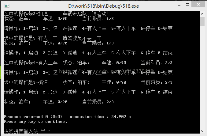 #include <iostream> #include<conio.h> #include <windows.h> using namespace std; enum vehicleStaus {rest, running}; //车辆状态:泊车、行进 class vehicle //车辆类 { protected: int maxSpeed; //最大车速 int currentSpeed; //当前速度 int weight; //车重 vehicleStaus status; //rest-泊车状态;running-行进状态 public: vehicle(int maxS, int w); //构造函数,初始时,当前速度总为0且处在停车状态 void start(); //由rest状态到running, 初速为1 void stop(); //由running状态到rest, 当前速度小于5时,才允许停车 void speed_up(); //加速,调用1次,速度加1 void slow_down(); //减速,调用1次,速度减1,速度为0时,停车 }; vehicle::vehicle(int maxS,int w):maxSpeed(maxS),currentSpeed(0),weight(w),status(rest) {} //启动 void vehicle::start() { if(status==rest) { status=running; currentSpeed=1; } else cout<<"车辆正在行驶!"<<endl; } void vehicle::stop() { if(status=running) { if(currentSpeed<=5) { status=rest; currentSpeed=0; } else cout<<"车速太快,先减速在停止!"<<endl; } else cout<<"车辆未启动!"<<endl; } void vehicle::speed_up() { if(status==running) { if(currentSpeed<maxSpeed) currentSpeed+=1; else cout<<"请不要超速行驶!"<<endl; } else cout<<"车辆未启队,请启动!"<<endl; } void vehicle::slow_down() { if(status==running) { if(currentSpeed>0) currentSpeed-=1; else cout<<"车辆已停止!"<<endl; } if(currentSpeed==0) { status=rest; } } class bicycle :virtual public vehicle//(1)自行车类的虚基类为车辆类 { protected: double height; //车高 public: bicycle(int maxS=10, int w=50, int h=0.7); //定义构造函数 }; bicycle::bicycle(int maxS, int w, int h):vehicle(maxS,w),height(h) {} class motorcar : virtual public vehicle//(2)机动车类的虚基类也为车辆类 { protected: int seatNum; //座位数 int passengerNum; //乘客人数 public: motorcar(int maxS=150, int w=1500, int s=5, int p=1); //定义构造函数 void addPassenger(int p=1); //增加搭载的乘客,超员要拒载,有人下车时,p为负数。当然车上乘客至少有1个(司机)。只有车停稳后才能上下客。 }; motorcar::motorcar(int maxS, int w, int s, int p):vehicle(maxS,w),seatNum(s),passengerNum(p) {} void motorcar::addPassenger(int p) { if(status==running) { cout<<"车辆行驶中,停车后再上车!"; } else { passengerNum+=p; if(passengerNum>seatNum) { passengerNum=seatNum; cout<<"超载,请正常驾车!"<<endl; } else if(passengerNum<1) { passengerNum=1; cout<<"请驾驶员不要下车!"<<endl; } } } class motorcycle:public bicycle,public motorcar//(3)摩托车类的基类为自行车类和机动车类 { public: motorcycle(int maxS=90, int w=100, int s=3, int p=1, int h=0.7);//定义构造函数 void show(); //显示摩托车的运行状态 }; motorcycle::motorcycle(int maxS, int w, int s, int p, int h):vehicle(maxS,w),bicycle(maxS,w,h),motorcar(maxS,w,s,p){} void motorcycle::show() { cout<<"状态:"; if(status==rest) cout<<"泊车;\t"; else cout<<"行驶中;\t"; cout<<"车速:"<<currentSpeed<<"/"<<maxSpeed<<"\t当前乘员:"<<passengerNum<<"/"<<seatNum<<endl; } int main( ) { motorcycle m; bool end=false; while (!end) { cout<<"请操作:1-启动 2-加速 3-减速 4-有人上车 5-有人下车 6-停车 0-结束"<<endl; cout<<endl; char keydown= _getch(); //_getch()返回键盘上读取的字符 switch(keydown) { case '1': cout<<"选中的操作是1-启动\t"; m.start(); break; case '2': cout<<"选中的操作是2-加速\t"; m.speed_up(); break; case '3': cout<<"选中的操作是3-减速\t"; m.slow_down(); break; case '4': cout<<"选中的操作是4-有人上车\t"; m.addPassenger(); break; case '5': cout<<"选中的操作是5-有人下车\t"; m.addPassenger(-1); break; case '6': cout<<"选中的操作是6-停车\t"; m.stop(); break; case '0': end=true; break; } m.show(); cout<<endl; Sleep(200); //要包含头文件<windows.h> } return 0; }