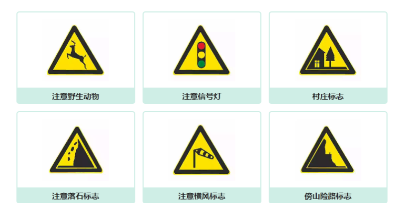 口诀:黄底黑字三角形,答案优先选注意;蓝底白图是指示,不要混淆成警告;红色标志是禁令,答案必定选禁止;绿底标志在高速,看图识字就可以;有人看守是栅栏,无人看守火车头;注意牲畜看老牛,野生动物是飞鹿;速度标志别眼花,红高蓝低灰解除。