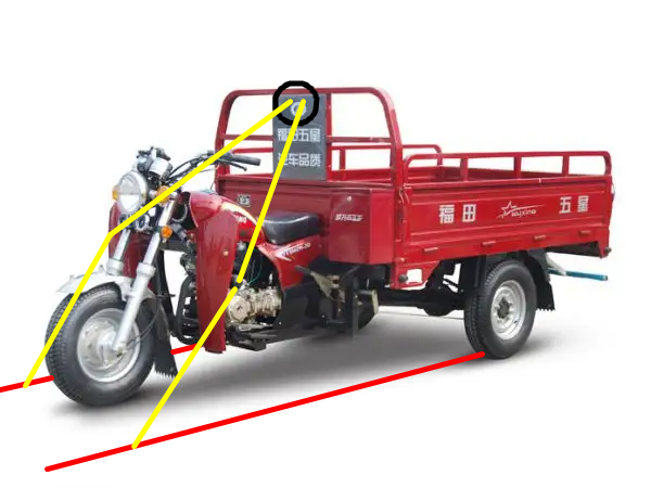 本人考的D证,有三轮摩托车驾驶基础的,不用报考驾校,考场是自动挡三轮摩托车。考D证的考友可以自己对照驾考宝典里的视频教程熟悉点位,在考试前坐上考试三轮车,目视一下三轮车两侧后轮往前延伸(图中红线),延伸线与自己坐好看到的三轮车车架上的点位,即为绕桩和单边桥的点位。具体操作对照视频摸索。