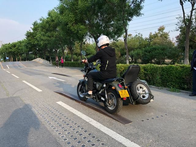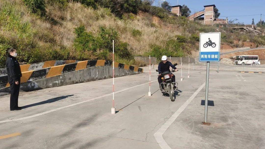 需要开启摩托车,绕过固定桩杆,不触碰桩杆为合格标准。