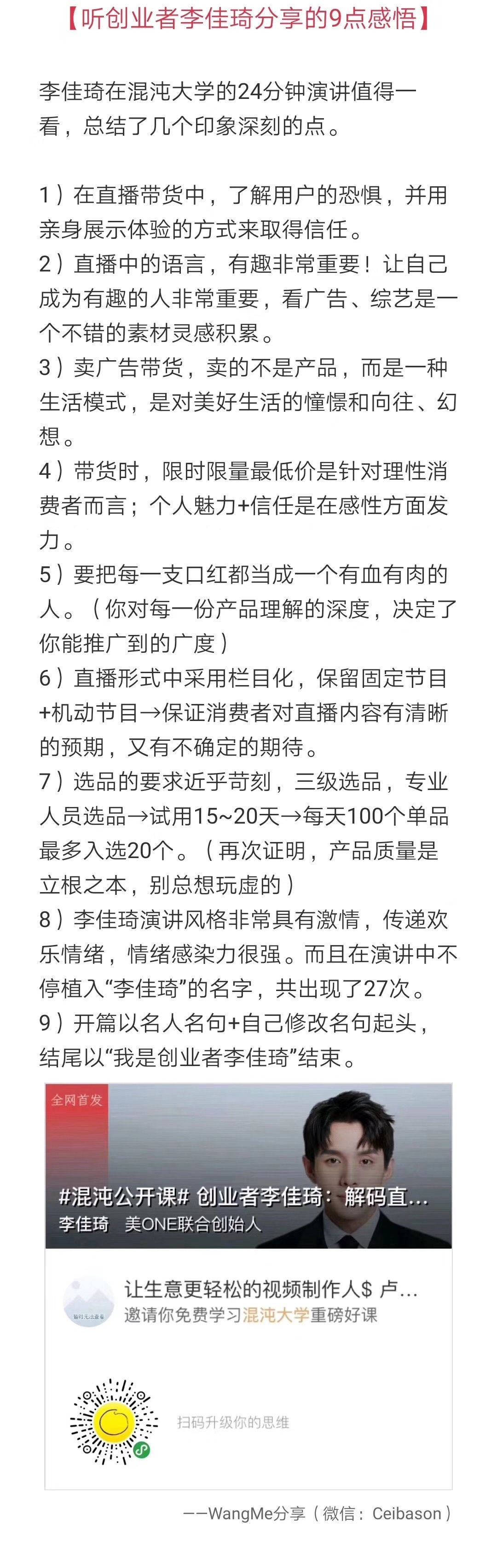 后来李佳琪去了混沌大学做了一次演讲,有人把他听后的感想分享了出来——