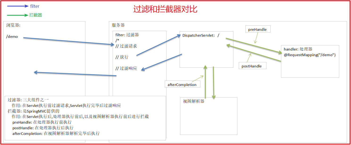 - 拦截内容不同:Filter对所有访问进行拦截,Interceptor仅针对SpringMVC的访问进行拦截
