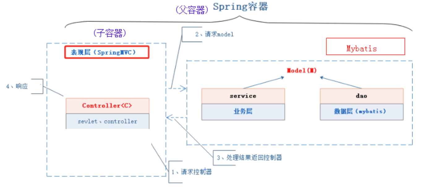 - SpringMVC,属于表现层 (使用自己独立的IOC容器)
