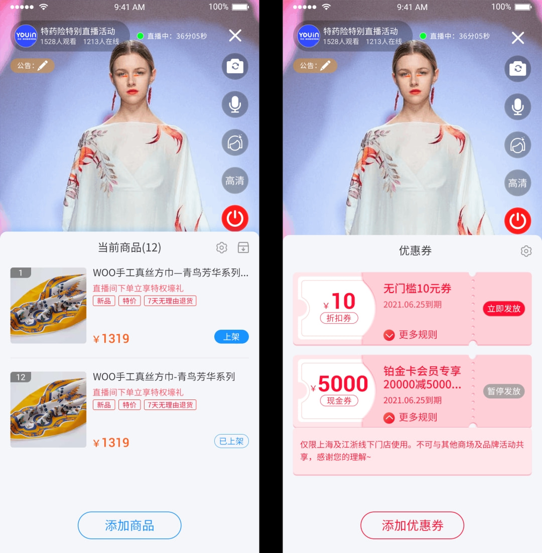 打开有因APP直播助手,快速便捷发起一场直播。用户可以自定义直播间名称、直播时间、直播封面图、为直播间添加商品,也可以打通商家自营商城系统,推送优惠券信息到直播间,完美实现带货直播,让私域流量快速变现。