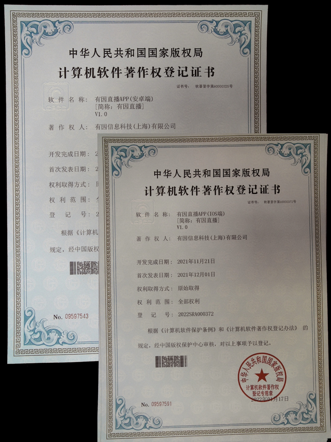 有因直播APP是一款体积轻巧、功能强大的推流直播工具,已取得国家版权局软著证书。