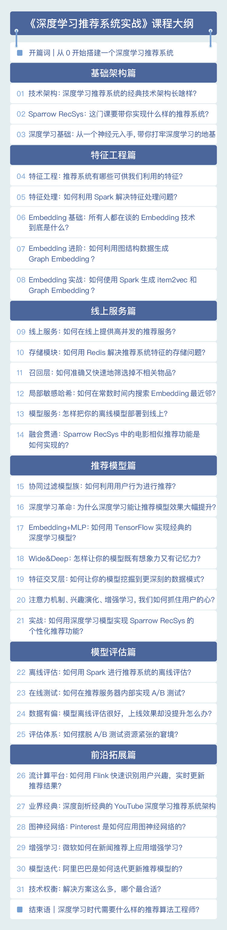 前沿拓展篇:将业界巨头们的深度学习推荐系统方案进行融汇贯通,重点讲解 YouTube、阿里巴巴、微软、Pinterest 等一线公司的深度学习应用,帮你追踪业界发展的最新趋势,并找到自己技术道路的方向。