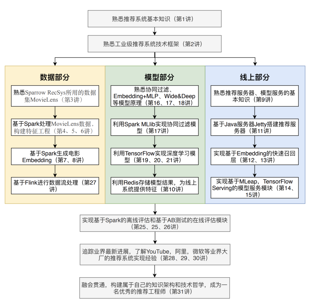 基础架构篇:从推荐系统要解决的主要问题入手,讲解我们要从 0 开始实现的推荐系统, Sparrow RecSys 的主要功能和技术架构,也会用到 Spark、Flink、TensorFlow 等业界最流行的机器学习和大数据框架。