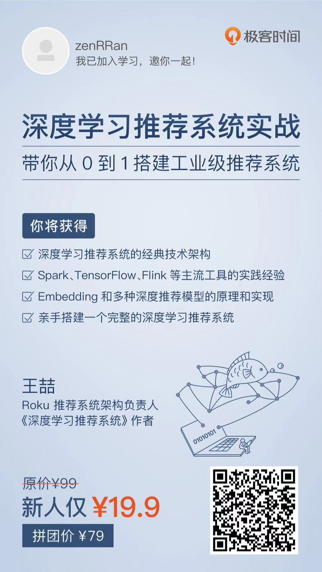 所以,当得知他推出了专栏《深度学习推荐系统实战》,我第一时间就订阅了,跟着学下来,真是受益匪浅,之前尝试过很多深度学习模型,但效果始终没有提升。直到遇到这门课,让我对深度学习推荐系统的认知到了一个新高度,很想把它推荐给你。