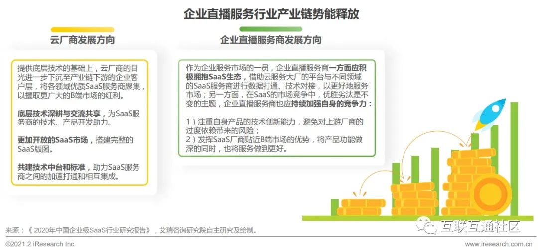 放眼到企业直播服务商所归属的企业服务SaaS市场,经过几年的高速发展,中国SaaS市场开始进入业务延展阶段,而整 体规模与美国等成熟市场仍有较大的差距,也反映出未来其所具有的广大市场空间。上游巨头对于SaaS生态构建的积极 尝试和合作探索正在不断加强和深化,为企业直播服务市场带来了更大的增长空间。可以预见,当云服务厂商、企业直播 服务商以及其他SaaS服务商通力协作,发挥各自的优势,能够加速推动业内技术交流和创新,以更低的成本满足企业客 户多样化的需求,以更加成熟完善的解决方案提升企业客户的运营效率和满意度,使更多企业享受到产业数字化带来的机遇和红利。