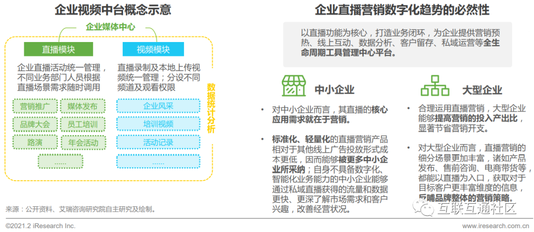 当前,中国企业数字化的浪潮仍在继续,可以预见,无论规模大小,无论行业,直播将逐渐成为大多数企业对内管理、对 外经营的必备能力。对于数量庞大、资源竞争力不足、抗风险能力较差且数字化能力不足的中小企业而言,以直播营销为 起点的数字化转型有望为其带来更广阔的商机和更优的经营决策参考;对于组织架构庞大、员工数量多的大型企业,以直 播为核心的企业的视频化部署也是其数字化转型过程中的重要步骤,结合了点播、直播、视频内容管理、数据分析的企业 视频中台能够在对外营销、内部会议、员工培训、品牌打造等多个场景下发挥效能。因此,企业直播服务在中小企业、大 型企业中的渗透率仍将持续上升。