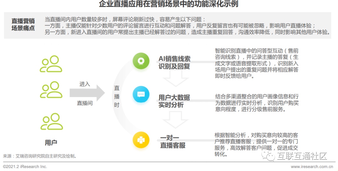 在企业直播服务的底层技术出现突破性进展之前,直播在应用层的产品功能和使用体验仍有深度探索和优化提升的空间。近一两年内,5G和超低延时技术有望全面改善直播的观看清晰度、流畅性和互动即时性。同时,企业直播产品与人工智能、 大数据分析等技术更深度的结合,有望拓展直播在特定业务场景的应用方式,从而解决一些企业当前在特定业务场景下的 直播痛点,提升运营效率。例如,在直播营销场景中,主播与大量用户的互动体验有望在未来通过AI技术、直播客服等模式得到优化提升。