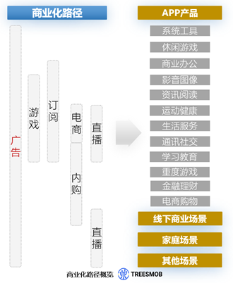 - 电商,这里的电商不是指电商本身,而是指其他非电商产品通过电商模式进行变现的商业化方法,运动健康,生活服务等通过电商售卖相关产品社区产品比广告变现的效率会高很多。