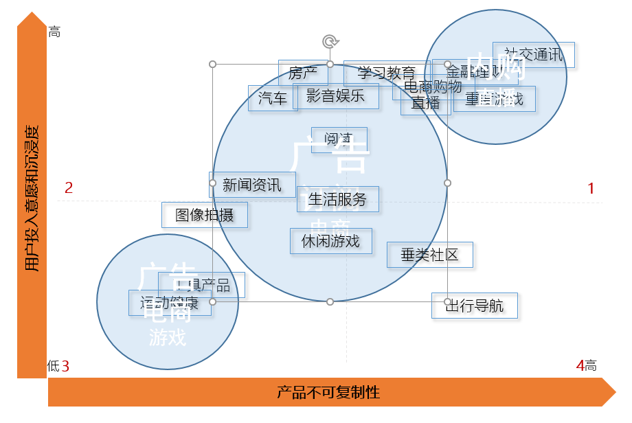 1,2象限的产品虽然商业化价值高,但是从用户的普适性和使用频率来说,靠近1,2象限的产品是低于3,4象限的(社交产品例外(所以你看为啥所有人打破脑袋都想做社交产品),),同时,由于相对低频,1,2象限的产品对流量导入的需求比较高。