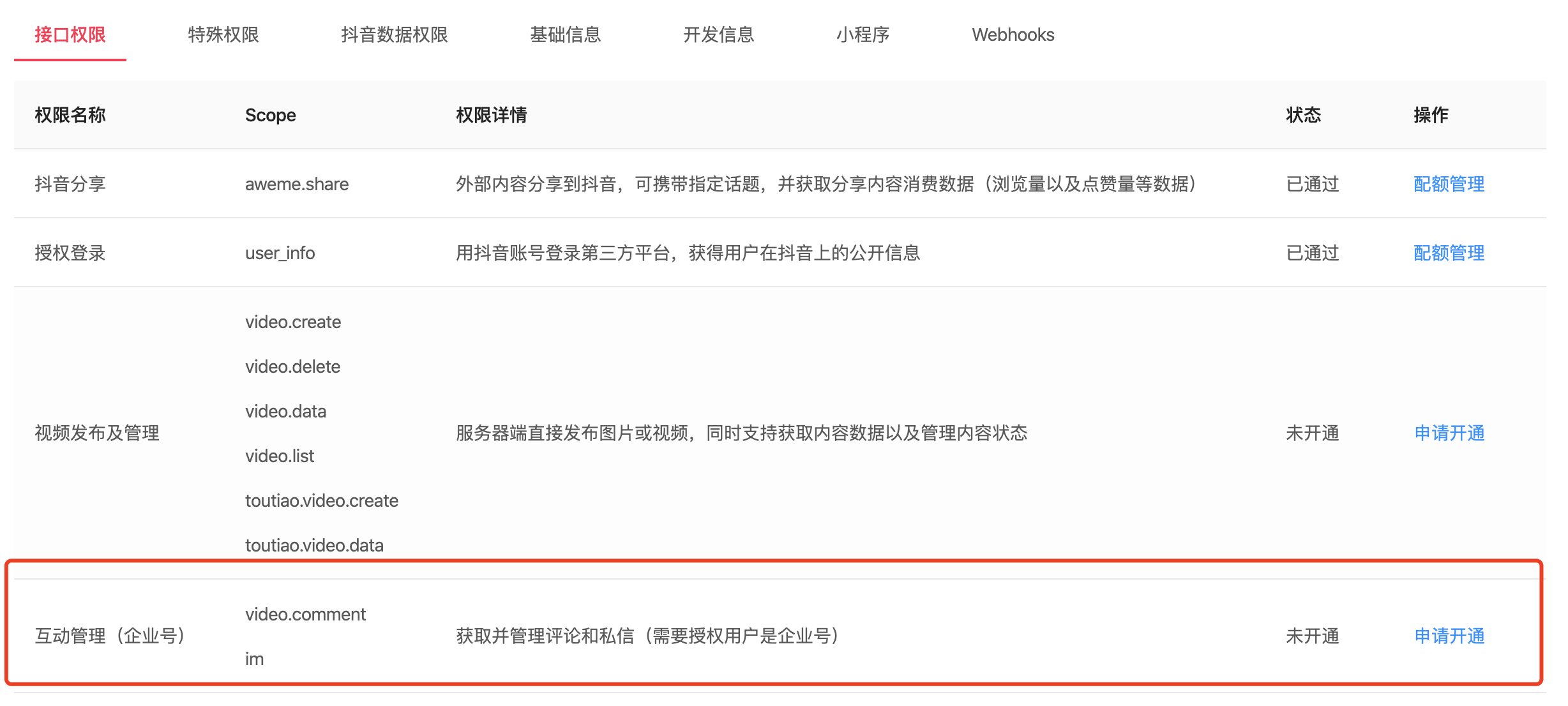 在开放平台【管理中心】-【应用管理】-【详情】-【接口权限】中申请“互动管理”权限