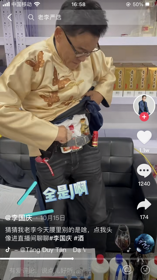 因为在直播间卖酒,李国庆又借着自己的裤腰带用了一次,他拍了一条自己在裤腰上挂满白酒的短视频,而那些白酒都是当晚直播间要上的产品。自己制造的热点自己蹭,一次流量两次利用,除了李国庆,恐怕没人能做到。