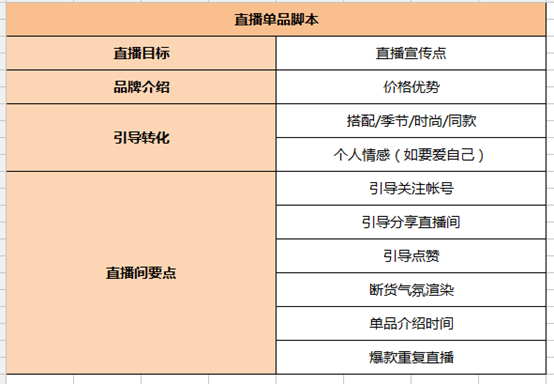 围绕“产品”来写的,产品卖点是核心;以服装为例,解说商品时可以围绕尺码、面料、颜色、版型、细节特点、适用场合、如何搭配来讲,解说过程中与粉丝进行实时互动,及时回答粉丝问题。建议大家以表格的形式写下来,品牌介绍、利益点强调、引导转化、直播间注意点都是表格里应该有的。这样能清晰地展现“重点”, 方便团队对接工作。