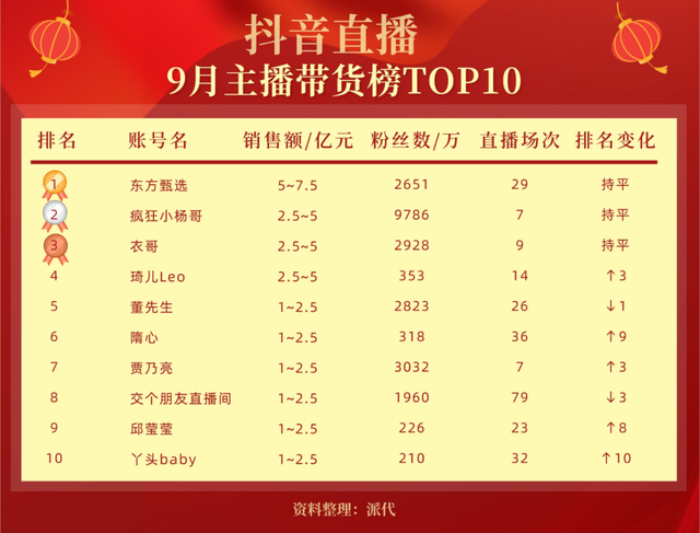 抖音最早的“台柱子”交个朋友直播间今年以来带货数据大幅下滑,在9月抖音带货榜TOP10中,仅仅排名第8;而靠“双语直播”爆火出圈一跃成为顶流的东方甄选,如今的场均销售额只在1000万-2500万之间,和他巅峰时期的6980万相差甚远。