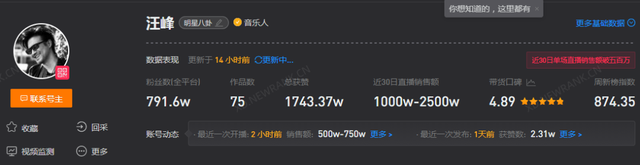 相关数据显示,截止至10月20日,汪峰已经进行了8次直播,近30日的直播销售额达到2500万,在8月29日的直播当中还曾登上带货榜第一名。