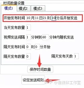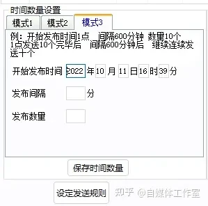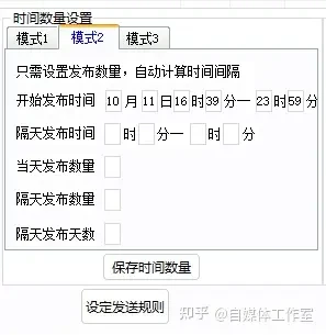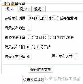 模式一和模式二在实现上相似,但模式二可以根据发布数量自动计算间隔,使得时间间隔更平均。相比之下,模式一则拥有更大的灵活性和一定的随机性。模式三较为少用,它可以实现连续发布一定数量后间隔一段自定义时间再继续发布。