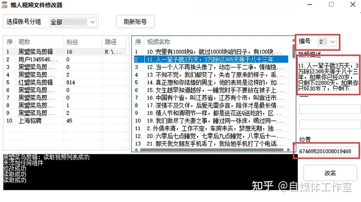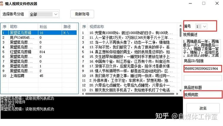 视频上传已经介绍完毕,接下来我们简要介绍一下视频管理。在这里,您可以通过账号分组选择所需的账号,并双击账号以加载所有视频。在此,您可以进行多项操作,包括将商品置顶、修改标题、批量删除视频、批量隐藏视频以及批量删除违规视频等功能。尤其对于拥有多个账号的用户,这一管理功能将非常实用。