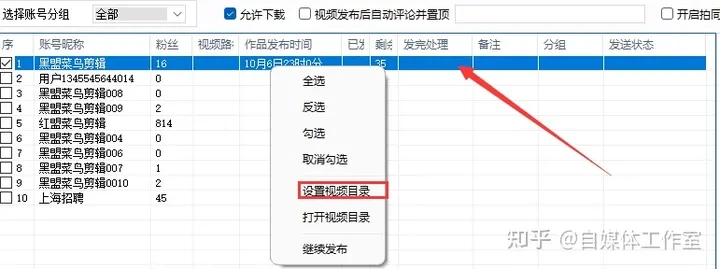 “立即发布”与“软件定时”功能少有使用,因此,重点介绍抖音中的定时发布设置。首先,在您的账号界面右键选择对应的视频目录,接着使用左键选中相应账号。仅通过此方式才可实现账号的选中状态,方便您设置下方的时间、发布方式以及组件等规则。