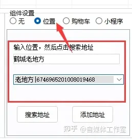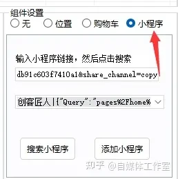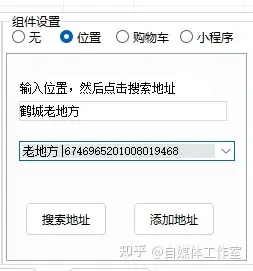 组件设置有四种方式:无、位置、购物车和小程序。如果选择无,就不需要添加任何内容。如果需要添加位置,可以通过关键词搜索并添加地址。购物车需要在巨量后台获取对接的商品链接,而小程序则需要在抖音对应的小程序获取链接进行搜索并添加。所有这些操作都非常简单,傻瓜式地进行即可,自己试一下就能够轻松掌握。
