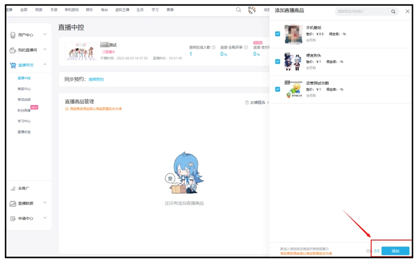 第一步:点击【添加商品】,勾选本场直播要添加的商品,点击【添加】按钮完成添加