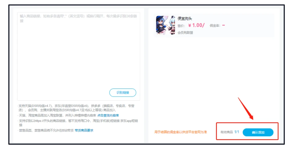 点击【识别链接】,识别成功后点击【添加】,完成商品添加