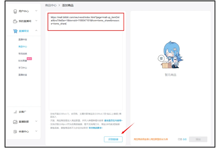 ● 如果在【商品中心】没有找到计划直播带货的商品,或是计划直播带货其他工房UP主的商品,则需要手动添加商品,操作步骤如下