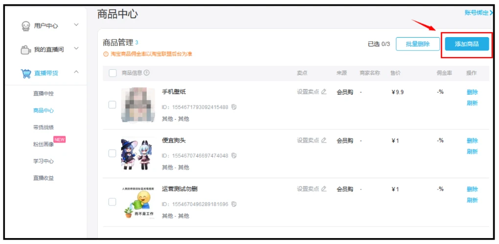 2、 使用PC端在直播中心添加商品【个人中心——直播中心——直播带货——商品中心——添加商品】