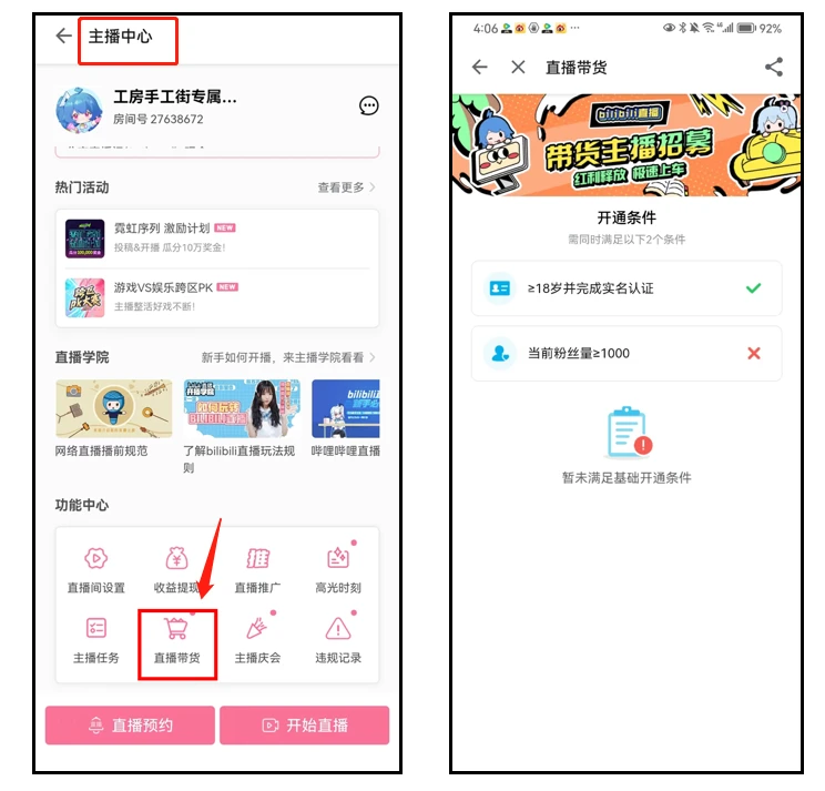 满足以下条件的UP主即可进行自助申请开通直播带货功能啦: