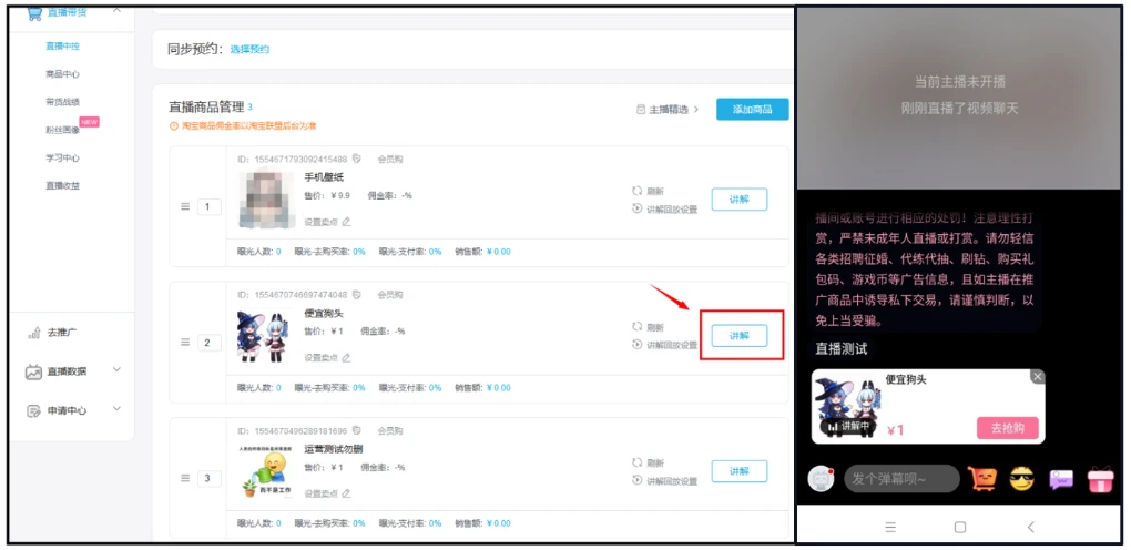 1、 点击【讲解】,将商品添加至个人直播间下端悬浮购物车进行讲解,效果展示如下: