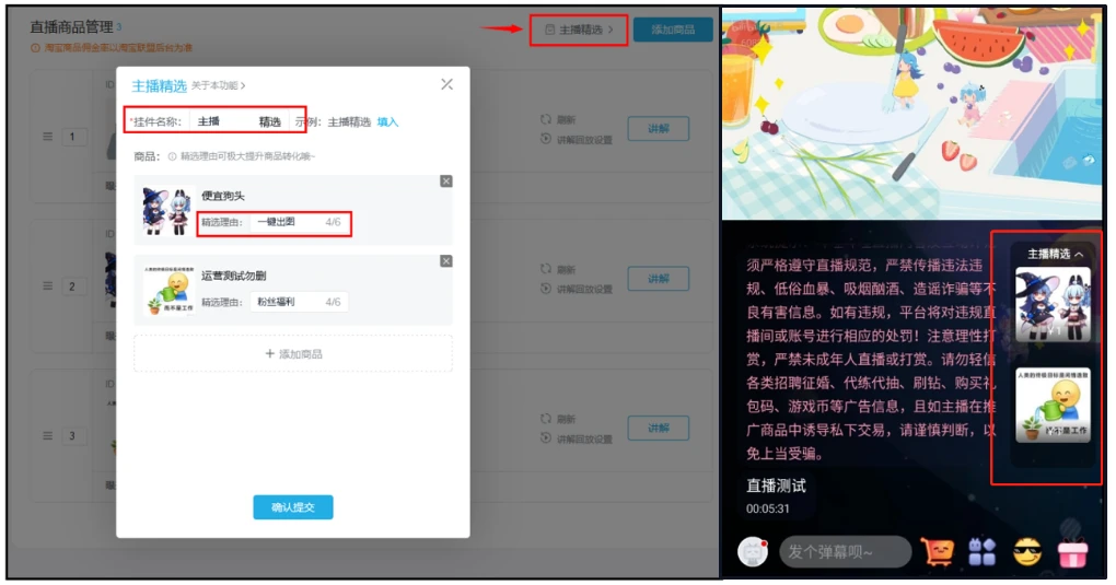 3、点击【主播精选】,自定义挂件名称和精选理由,效果展示如下: