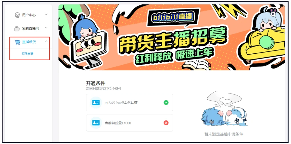 满足以下条件的UP主即可进行自助申请开通直播带货功能啦: